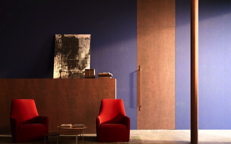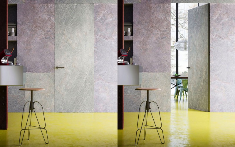 IN-FINITO von LÍnvisibile erlaubt eine Türverkleidung mit dekorativen Materialien oder Oberflächen. Das Türblatt besteht aus einem umlaufenden Aluminiumrahmen in den verschiedene Materialien bis zu einer Stärke von 4 mm eingelegt werden können. Diese Konstruktion erlaubt die verzugfreie Anwendung von unterschiedlichen Materialien auf Türaussen- und Türinnenseite. Die unsichtbare Türzarge entspricht dem patentierten Rahmensystem aller LÍnvisibile Produkte und sitzt absolut Flächenbündig in der Wand.